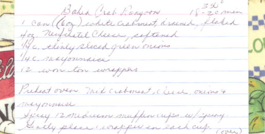 Average Rating: (0 / 5)Wonton wrapped crab and cheese, baked in muffin cups